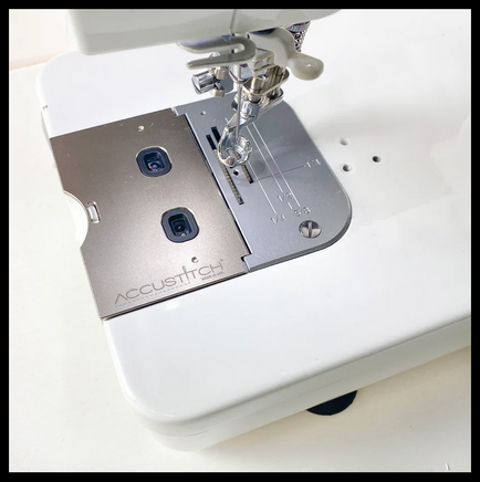 Accustitch is Quick and easy to install! Replace the throat plate cover, plug in the components, drop your feed dogs, and you are set to quilt! Please note that you may need to change your free-motion foot to a height-adjustable ruler foot. If your foot hops (pushes) on the fabric and needle plate, it creates stiction and a delay that the sensors can detect and your fabric won't glide as smoothly. Check out this video on choosing the correct foot for optimal results.