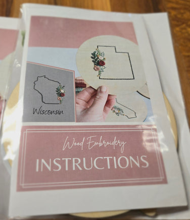 Kit includes: Wood laser cut disc, felt adhesive backer, embroidery thread, needles, instruction sheet, and easel. All of our embroidery and yarn kits are packaged in a cellophane sleeve with a backer, all of the supplies and instruction sheet.