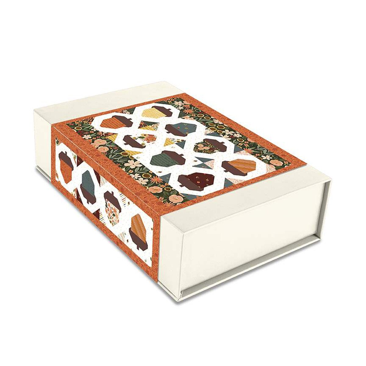 The Acorn Love Runner Kit includes pattern and fabric for runner top and binding. Backing not included. Fabric featured is Happy Fall Days by Kelsey Carlson. Pattern is by Lori Holt of Bee in my Bonnet. Finished size is 15" x 65". Kit comes in a solid box with a printed belly band label. Box size is approximately 6" x 10" x 2 1/2".