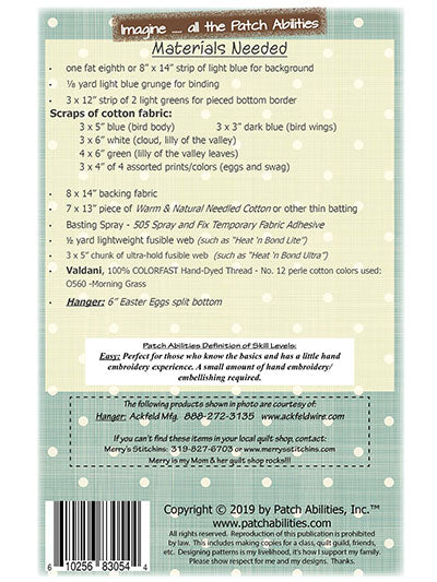 Some call this a Spring mini quilt, you may call it an Easter mini quilt. Create a Spring or Easter wall hanging using this pattern featuring a bluebird carrying an Easter egg, Lily of the Valley spring flowers, and a spring swag in the sky.
