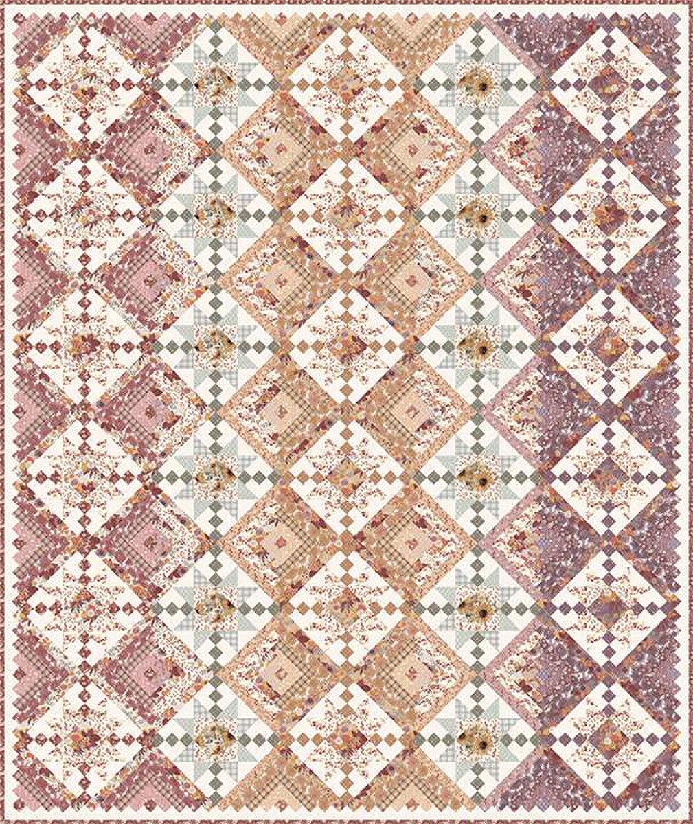 The Laura's Log Cabin Quilt Kit includes pattern and fabric for quilt top and binding. Backing not included. Fabric featured is Evening on the Prairie by Modern Prairie. Pattern is also by Modern Prairie. Finished size is 84" x 100". Kit comes in a keepsake box. Box size is approximately 11" x 12" x 3 3/4".
