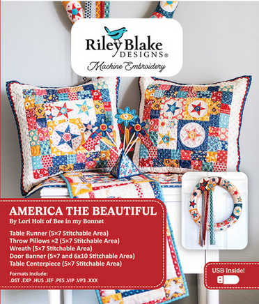 Create the America the Beautiful projects with In-the-Hoop piecing and machine embroidery applique techniques using exclusive Bee in my Bonnet cover stitching! Uses free standing applique techniques. Bring the Americana collection to life with these 3D machine embroidery elements and projects.