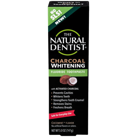 The Natural Dentist Charcoal Whitening Fluoride-Free Toothpaste uses one of the world's great, time-tested elements: activated charcoal sourced from coconut husks. Use it for whiter teeth, a cleaner mouth and fresher breath. An effective fluoride free toothpaste that's also SLS free and made WITHOUT artificial colors, flavors or sweeteners and without artificial preservatives. No SLS, no gluten, no fluoride, no triclosan. The Natural Dentist Charcoal Whitening Fluoride-Free Toothpaste has a great Cocomint flavor - created with natural mint and coconut oil. Vegan. No animal testing. Gluten free.